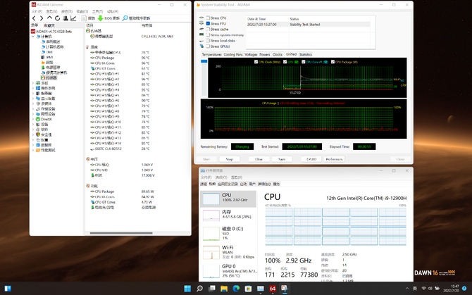 首先来看看散热和CPU功耗,机械师曙光16在散热上采用了双风扇、石墨均热片主板散热方案,通过异构鳍片智能分配风量,大大提升了散热速度。开启狂暴模式、独显直连和最大风速,使用ADIA64的FPU选项进行压力测试,CPU功耗在初始时可以达到115+W,之后降至88+W平稳,CPU核心温度80°C,速度2.92GHz。