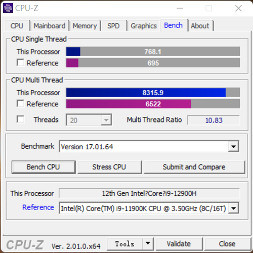 CPU-Z内置的测试中,单线程任务处理得分768,多线程任务处理得分8316。相比在CPU-Z列表里的酷睿i9-11900K多线程得分提升22%。