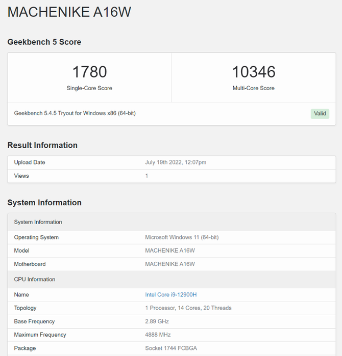 GeekBench是测评CPU较常用的工具,在GeekBench 5.4.5的测试中,酷睿i9-12900H在机械师曙光16上的单核成绩1780,多核成绩10346。