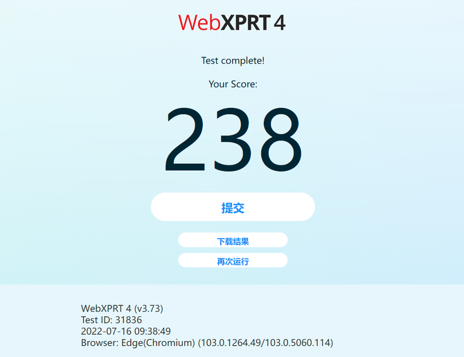 WebXPRT是一款主打应用场景的测试平台,通过照片增强、人工智能整理相册、股票期权定价、OCR扫描、销售图表、网上作业等的六个常用应用场景,给PC性能进行打分。最终结果可见,在WebXPRT上的综合得分为238,也意味着机械师曙光16在办公、金融、教育等多个领域都能轻松胜任。