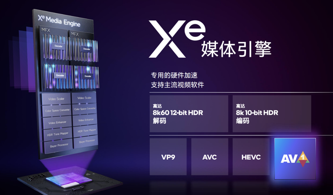 英特尔锐炫 A 系列独立显卡的产品均基于英特尔全新 Xe HPG 微架构而打造,专为游戏玩家和内容创作者量身设计。Xe HPG 为英特尔锐炫显卡提供了出色的性能、能效和可扩展性,此外,还提供了强大的 AI引擎和支持下一代编解码器标准的增强媒体引擎。