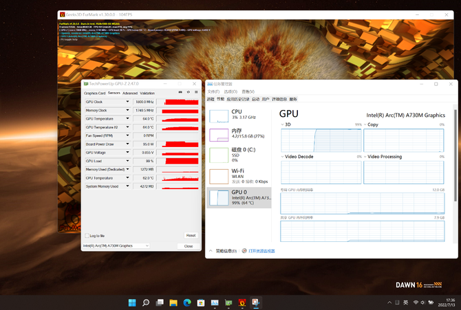 GPU单烤使用FurMark软件进行测试,1920×1080分辨率, GPU温度为64°C,功耗95W。