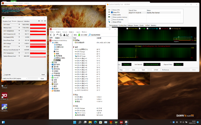 在CPU、GPU双烤模式下,CPU温度68°C,功耗45W,GPU温度68°C,功耗95W,整机性能释放非常强劲。