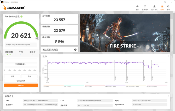 DX11的基准测试中,Fire Strike综合得分20621,显卡分数为23557。