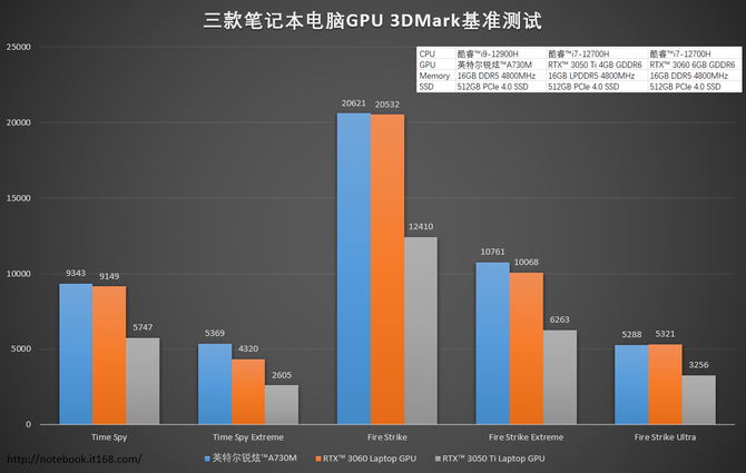 我们对比了此前测试过的RTX 3050 Ti、RTX 3060笔记本电脑GPU的3DMark测试,取综合成绩进行对比,可以看到英特尔锐炫A730M显卡的成绩略高于RTX 3060,相比RTX 3050 Ti笔记本电脑GPU,Time Spy得分提升38%,Fire Strike提升约40%,各项测试的详细得分见下图。