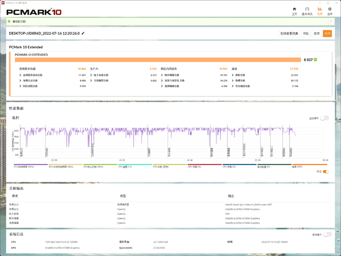 在效率方面,使用具有场景化的PCMark 10 Extended模式进行测试,测试的项目包括了常用基本功能、生产力、数位内容创作和游戏,并在每个项目里给出了更加具体的成绩。综合得分8037,游戏的得分达到了17319,显然更具优势。