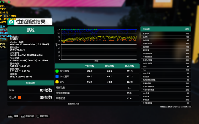 《极限竞速:地平线4》内置的性能测试中,分辨率1920×1200,刷新率165Hz,垂直同步开启。CPU模拟的平均帧数180.7,GPU平均帧数91.9,能够很流畅运行。