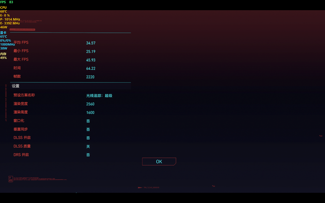 《赛博朋克2077》最近更新增加了内置的基准测试,2.5K分辨率,开启光线追踪为超级,测试的帧数为2220,获得平均FPS为34.57,最大FPS为45.93。