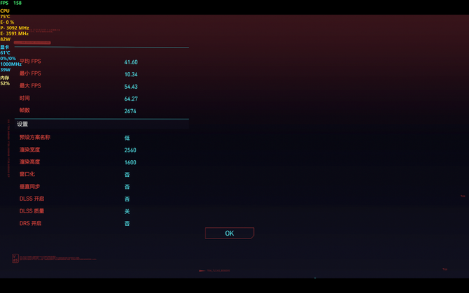 预设为高模式,关闭光线追踪,测试帧数提升到2674,最大FPS为54.43,平均FPS为41.60。可以流畅运行。