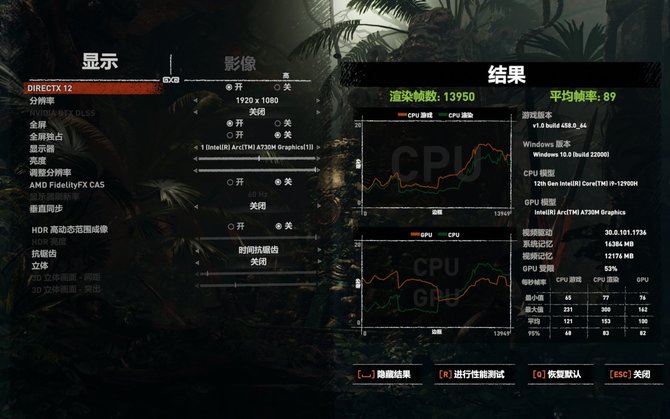 1080分辨率,关闭光追,预设为高,渲染帧数13950,平均帧率89。