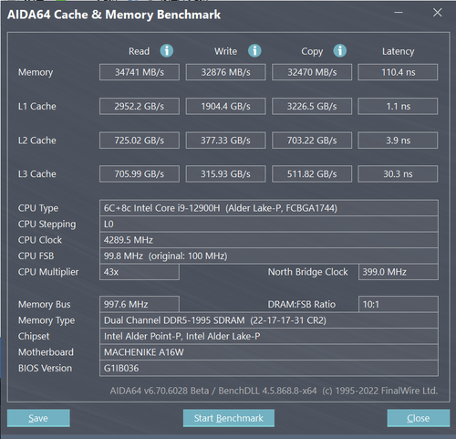 继续来看看内存和硬盘存储。这款机械师曙光16搭载了16GB DRR5 4800MHz双通道内存,使用AIDA64内存测试,读取速度为34741MB/s,写入速度32876MB/s,copy速度32470MB/s,时延110ns。