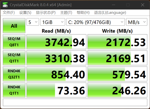 性能方面,测试顺序读取速度位3742.94MB/s,顺序读取速度为2172.53MB/s,可以满足日常大型文件的copy,以及系统或程序的快速加载。