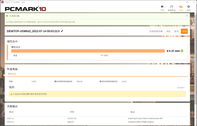 机械师曙光16还内置了一个80Wh的锂电池,并提供智能快充技术,可以满足日常多种场景的续航需求。使用PCMark 10进行测试,系统电量100%,屏幕亮度40%,关闭键盘背光、蓝牙,系统设置为高效能,智能控制中心设置为办公模式,关闭独显直连。在现代办公场景下,最终获得6小时21分钟的续航,系统剩余电量6%,作为一款高性能游戏本,能有超过6小时的续航,已然不错。