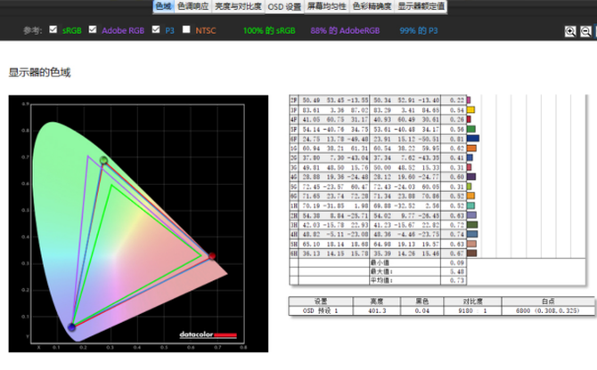 实测下来默认模式下99%的P3色域,6800的白点色温,色准平均值为0.73,有着丰富的色彩呈现和细节,无论是日常办公还是观影游戏,整体的画面表现都相当亮眼。