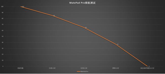续航上,屏幕亮度锁定200nit,音量50%的状态下。连续3小时游戏,再加3.6小时的B站1080P视频播放,也就是华为MatePad Pro重度使用可以支撑超过6小时。如果是日常轻度使用,1~2天一充没压力。