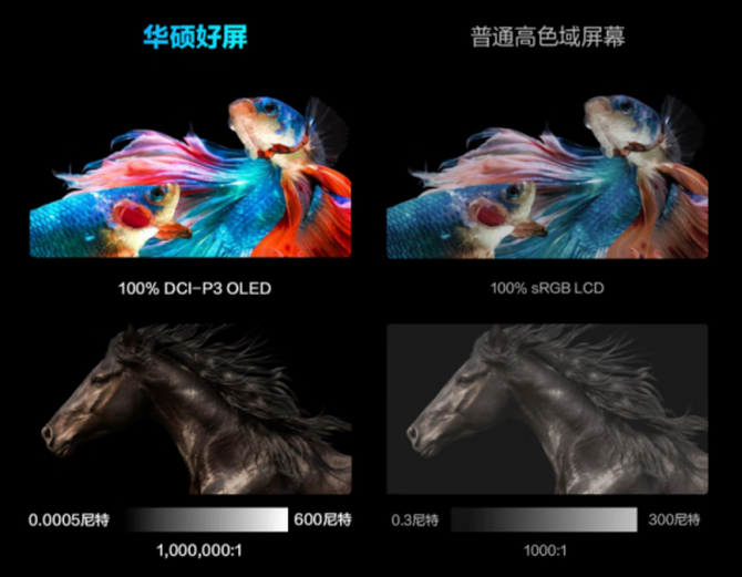 另外,华硕无双还配备了2.8K OLED屏幕,这在同价位笔记本中是非常少见的。OLED由于采用了有机自发光材质,可以实现像素级点控光技术,即拥有超高的对比度。同时色彩方面支持100% P3广色域10bit色深,能够让画面色彩绚丽且清晰度更高。