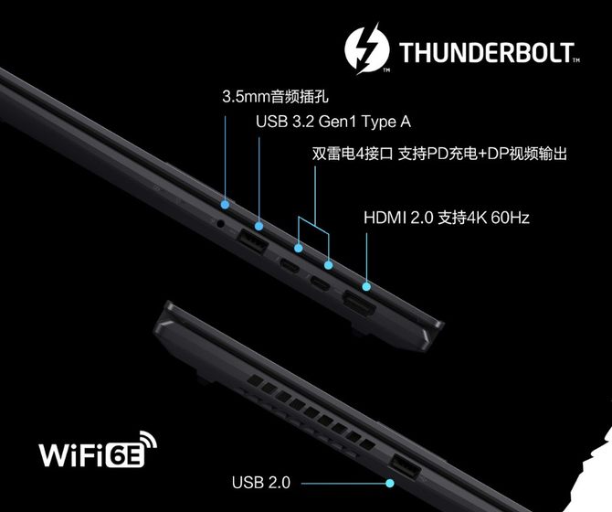 高速连接是英特尔Evo认证的标准之一,华硕无双配备了双雷电4接口,数据传输速度可达40Gbps,支持PD充电+DP视频输出。此外还有HDMI 2.0,支持4K 60Hz的显示输出。USB 3.2 Gen1 Type-A、USB 2.0、3.5mm音频插孔,以及高速无线Wi-Fi 6E支持,满足日常外设的连接需求,兼容性更好。