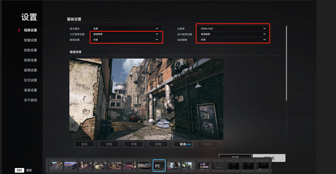 在《生死狙击2》中,我们将画面效果设置为极高模式,阴影质量极高,渲染等级极高。垂直同步关闭,帧率自动,景深开启,分辨率2560×1440,战斗帧率自动,这样的设置几乎已经达到游戏的最高性能。