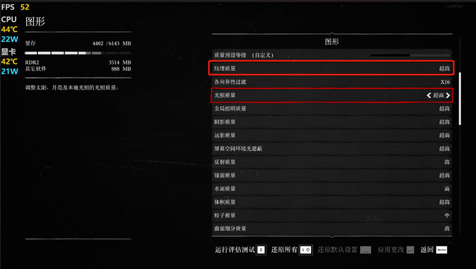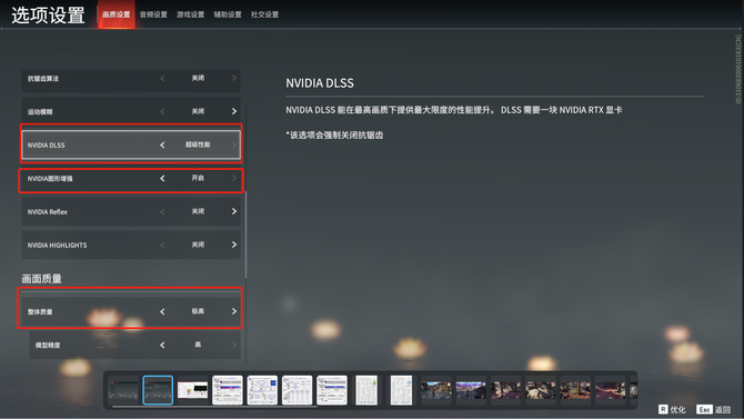 我们测试中将游戏分辨率设置为1080P,垂直同步关闭,纹理质量超高,光照质量超高,DLSS为超高性能。