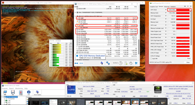 室内温度25℃,打开狂暴模式、显卡直连。使用FurMark压力测试连续运行16分钟,可以看到温度曲线缓慢上升,从37℃到76℃稳定,GPU功耗140W,频率1845MHz,此时的GPU负载为100%。单烤看上去毫无压力,而且机身表面的手感温度也没有明显升高,甚至低于体温。