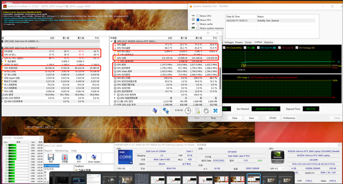 我们继续加载CPU烤机,看看其在双烤下的表现。在开启GPU+CPU双烤后,连续运行27分钟。此时,GPU温度77°C,功耗131W+,CPU温度73°C,功耗28W+,整机依然有近160W的功耗释放。