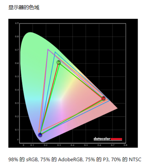 我们使用Spyder5 Elite红蜘蛛5代校色仪对全新荣耀MagicBook X 14的屏幕进行实测,色域方面,98%的sRGB,70%的NTSC,显示效果已经相当不错。