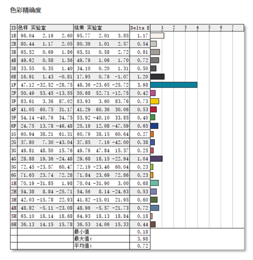 色彩精准度ΔE值反映了显示屏与标准值之间差距的大小,因此其数值越小越好。测试结果可见,测试的24种颜色显示的平均ΔE值为0.72,最小值为0.18,最大值为3.98。并且测试的24种颜色,大多数色彩的ΔE值都在1以下,整体表现非常优异。