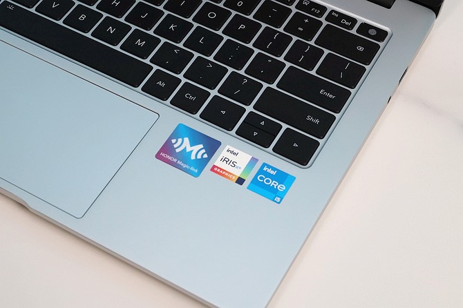 键盘方面,荣耀MagicBook X采用了全尺寸、大间距按键,旗舰级的1.5mm长键程,微凹弧面设计,使得按压回弹有力,并且舒适静音。可调背光设计,即便是在黑暗的环境下也可以很清晰的纵览全局,快速打字而不会误按。此次全新的键盘架构设计,还将电源键调整到键盘区域内,同时指纹解锁、电源键二合一。另外值得注意的,在拥有超静音打字体验的同时,这款键盘还采用“仿荷叶”防污设计,使得键盘防污性提升11%,比如我们在使用电脑时,不小心将咖啡、奶茶,或者是点心沫掉落在键盘上,简单擦拭就能继续使用;或者是有水果、孩子的玩具等略重物体掉落在键盘上,其冲击力也不会造成电脑的损坏,所以,荣耀MagicBook X系列笔记本在品质上的提升是看得见的。