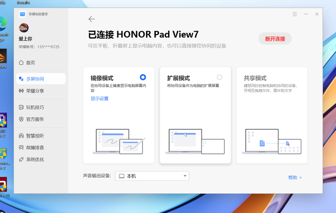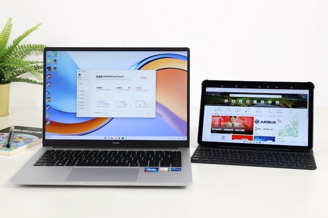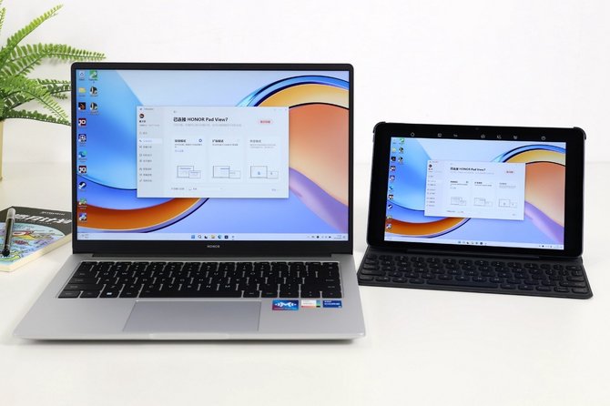 我们以连接荣耀平板为例,通过简单连接匹配后,你可以将PC桌面镜像或扩展到平板,把平板当作第二块屏幕,多个窗口显示,效率自然翻倍。