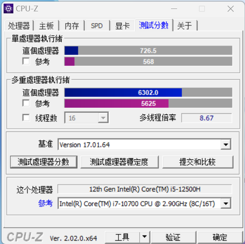 最新版CPU-Z内置的测试中,单核性能得分726.5,多核性能得分6302。对比内置列表中的酷睿i7-10700,单核性能提升约22%,多核性能提升11%。