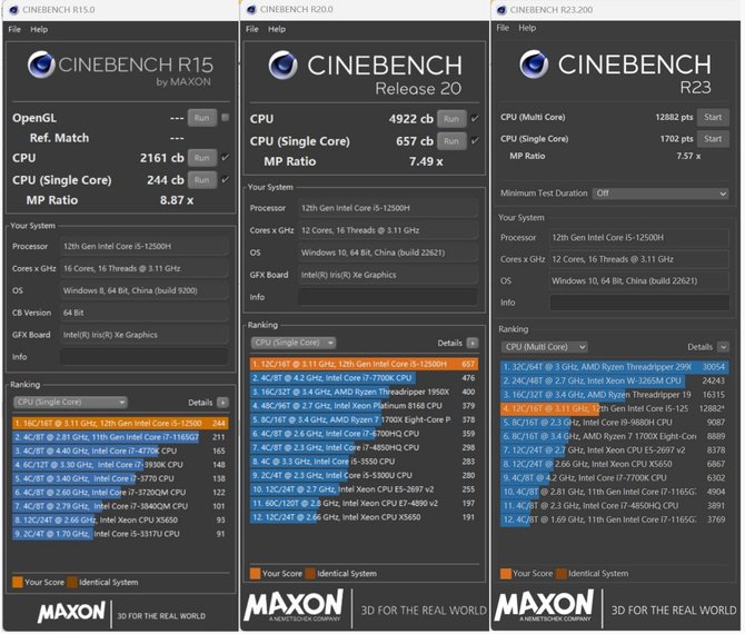 CINEBENCH的测试中,R15单核得分244cb,多核得分2161cb;R20单核得分657cb,多核得分4922cb;R23单核得分1702pts,多核得分12882pts。
