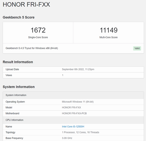 GeekBench是测评CPU较常用的工具,并且模拟多种应用场景进行测试并给出得分。在GeekBench 5.4.5的测试中,酷睿i5-12500H在全新荣耀MagicBook X 14上的单核成绩1672,多核成绩11149。