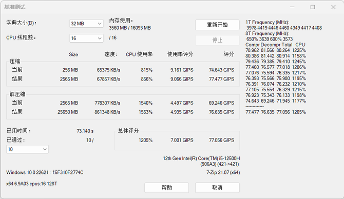 在7-Zip的基准测试中,酷睿i5-12500H处理器的总体评分为77+GIPS。相比上一代酷睿i7-11800H的70 GIPS有所提升。