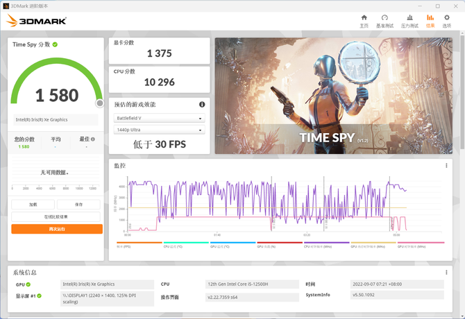 3DMark Time Spy的综合得分1580,其中显卡得分1375。