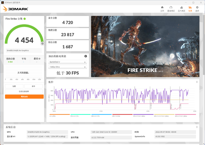 3DMark Fire Strike综合得分4454,显卡分数4720。