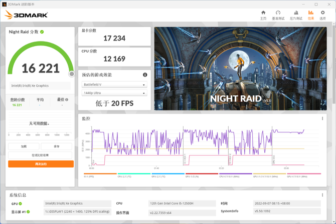 Night Raid主要针对有集成显卡的PC进行评价,更为适合。综合得分16221,显卡得分17234。