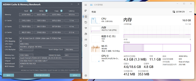 内存和硬盘性能的好坏同样会影响到笔记本性能的发挥。全新荣耀MagicBook X 14 笔记本 2022 搭载了16GB LPDDR5 4266MHz高速内存,在AIDA64的内存测试中,读取速度62198MB/s,写入速度65631MB/s,Copy速度62935MB/s,时延101.8ns,整体性能处于当前的旗舰级水平,可以为多任务处理带来更流畅运行。