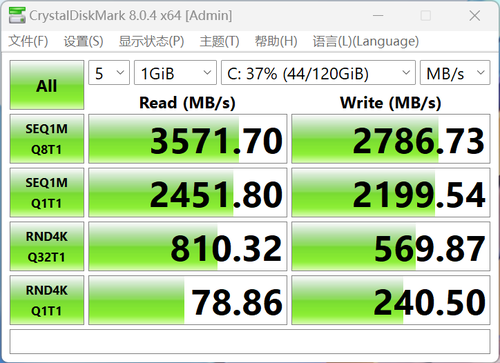 性能上,这款SSD的顺序读取速度3571MB/s,写入速度2786MB/s,对于系统快速启动,以及快速加载大型程序、游戏,或者copy数个GB的大文件而言,这样的速度完全够用。
