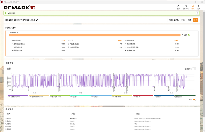 轻薄笔记本主要还是用于办公生产力工具,那么这款全新荣耀MagicBook X 14又有怎样的优势呢?我们使用PCMark 10来跑个分看看。在模拟办公的测试场景中,运行的项目包括常用基本功能、生产力、数位内容创作。其中常用基本功能又包括应用程序启动、视频会议、网页浏览;生产力包括电子表格和文档编写;数位内容创作包括照片编辑、渲染与视觉化、视频编辑,基本上覆盖了日常常用的操作行为。最终的综合得分为5387,常用基本功能得分更具优势。