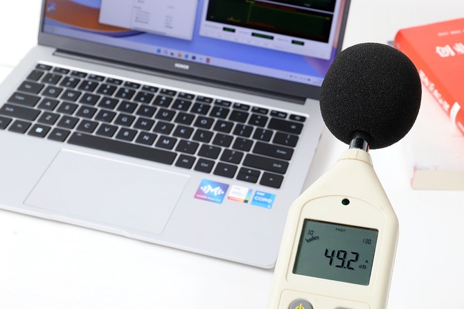 身处办公环境,电脑的噪音不仅会影响自己,也会影响到别人,扰人心烦也就影响到了工作效率。我们将荣耀MagicBook X 14设置在高性能模式的烤机状态,此时风扇的转速达到最大,噪音也随之增加。使用噪音测试仪在距离人耳位进行测试,49.2dB的噪音完全在可接受范围内,尤其是相比我们平时测评的游戏本而言,这真的可以算是静音了。