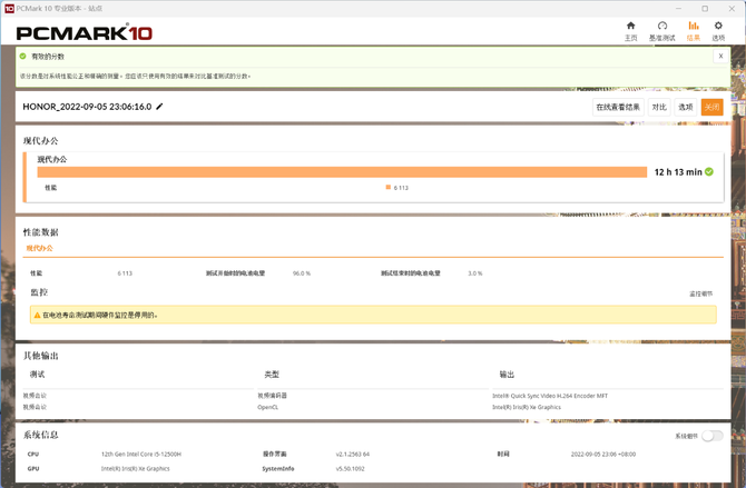 我们使用较为常用的PCMark 10模拟办公场景进行测试,测试开始前的电池电量96%,屏幕亮度调整为40%,关闭蓝牙和定位,关闭键盘背光,系统电源模式为最佳能效,无线开启,最终获得12小时13分钟的续航,高于官方标称续航成绩,而且同样测试条件下,我们测试过的轻薄本里,全新荣耀MagicBook X 14的续航也是非常给力的。