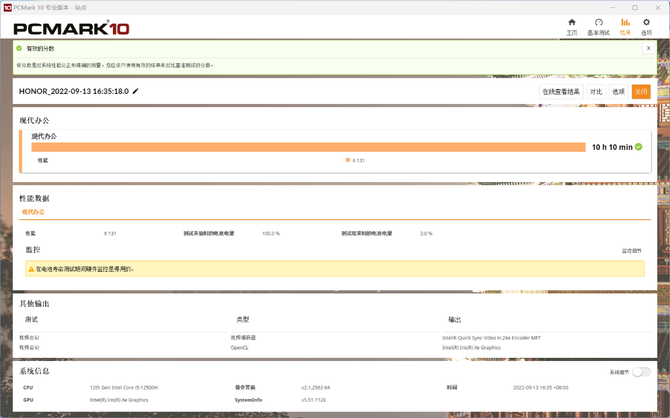 如果你认为上面的测试可能不太满足性能需求,我们再来换一种方式,屏幕亮度60%,系统电源为最佳性能,无线、蓝牙开启,这已经是办公时的较高性能模式了,同样使用PCMark 10的现代办公模式进行测试,最终获得10小时10分钟的续航,依然是很不错的成绩。