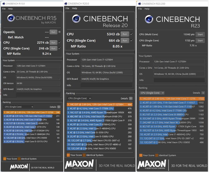 首先我们使用媒体们最常用的CINEBENCH测试软件来跑个分,CPU性能好不好,CINEBENCH的成绩可以说明一切。在R15的测试中,单核成绩246cb,多核成绩2274cb;R20的测试中,单核成绩664cb,多核成绩5343cb;R23的测试中,单核成绩1722pts,多核成绩13342pts。这样优秀的成绩如果只是应对日常办公那可是大材小用了,要知道这款酷睿i7-12700H处理器即便是在游戏本上也是主流配置。