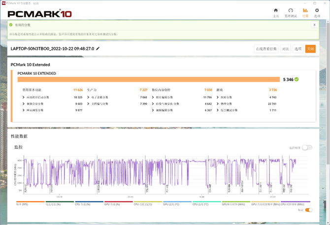 PCMark 10同样可以检测笔记本电脑的综合性能,其通过模拟真实的现代办公场景进行较长时间的交叉运行,包括视频会议、网页浏览、电子表格和文档编写,以及照片编辑、渲染,以及在游戏中的表现等。最终的综合得分为5346,其中常用基本功能得分达到11626,生产力得分7227,数位内容创作得分7038,游戏得分3736。