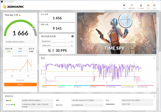 虽然我们体验的这款惠普星14 Pro是集成显卡。显卡性能好不好,通过3DMark跑分就能知道了。在Time Spy的跑分中,显卡成绩1456,CPU成绩9141,综合得分1666。虽然是集显,这样的成绩却是可以流畅运行包括LOL、守望先锋、CSGO这样的游戏了。