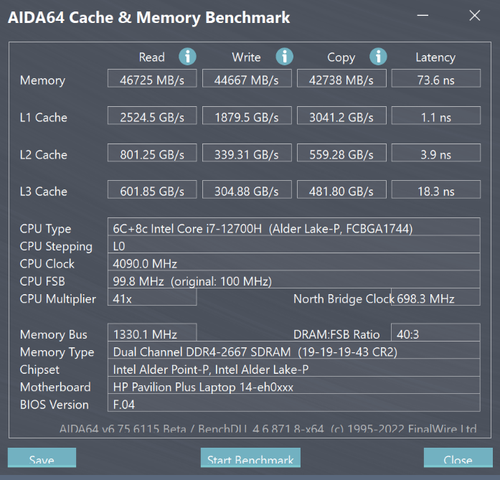 惠普星14 Pro搭载了16GB双通道高频内存,足以应对多任务处理,使用AIDA64进行测试,读取速度46725MB/s,写入速度44667MB/s,延迟73.6ns,这个速度还是很给力的。