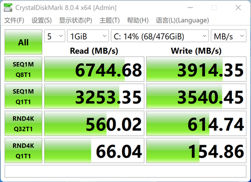 硬盘方面,搭载了512GB PCIe 4.0 固态,顺序读取速度6744MB/s,写入速度3914MB/s,整体性能处于中高端,日常想要拷贝个大文件视频素材,几乎能秒传了。