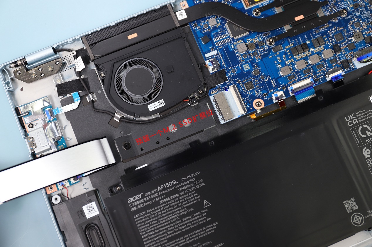 值得一提的是,这款笔记本还多提供了一个M.2 SSD接口,对于想要升级更大存储空间的用户,这非常贴心。散热方面,单风扇、单加粗热管,可以满足锐龙7 6800U处理器15~28W功耗的散热需求,而且即使在高负载下,其产生的噪音也很低,几乎可以忽略不计。