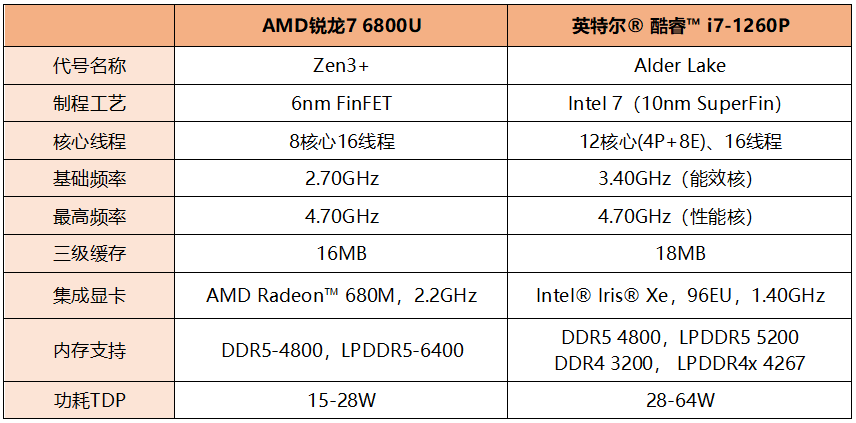 硬件性能:锐龙7 6800U VS 酷睿i7-1260P大核大显优势明显