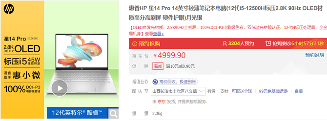 笔者刚好在惠普京东自营店了解到,惠普星14 Pro高性能轻薄本正在进行开工预约抢购活动,平时5000多元的价格如今直降到4999元,要知道这款轻薄本拥有OLED屏幕和十分硬核的配置,目前的价格非常具有竞争力。